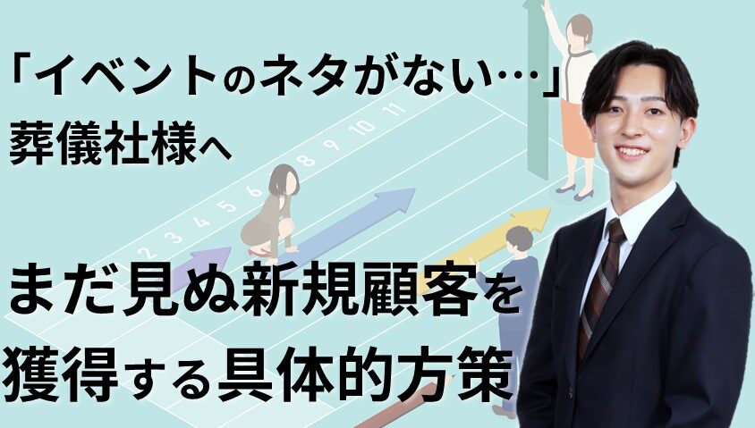 葬儀社の集客経路には、イベント・Web・チラシ・施設や警察からの紹介など様々ありますが、このコラムをご覧の皆様はイベントで新規顧客獲得できていますか? 会館をオープンしてすぐは、オープン販促によってイベント集客や入会が盛んに行われていたものの、オープンから時間がたって反響が下がってきたという葬儀社...