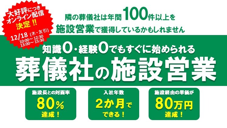 8/30に開催した「【葬祭業向け】施設営業で売上9,000万円達成セミナー」が大変人気だったため、オンラインにて再開催させていただくことになりました!オンライン開催分も続々とお申込みいただいています。